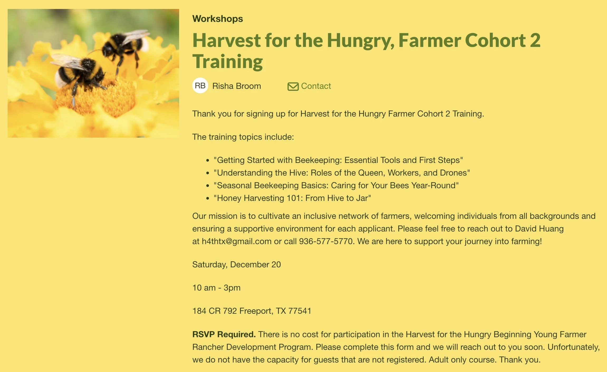 This program is a transformative 12-month farm training initiative, merging a robust classroom curriculum with a hands-on practicum at the H4H Farm and a state-of-the-art training facility sprawled across 61 acres in Freeport, Texas. This training will be lead by esteemed experts from Texas A&M AgriLife, Brazoria County Master Gardeners, University of Houston, Harvest for the Hungry, Hives for Heroes, and other distinguished institutions.